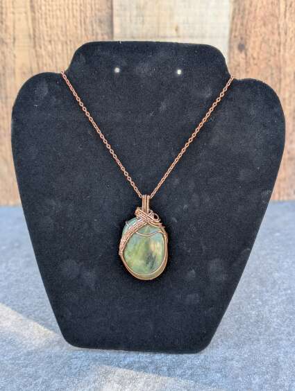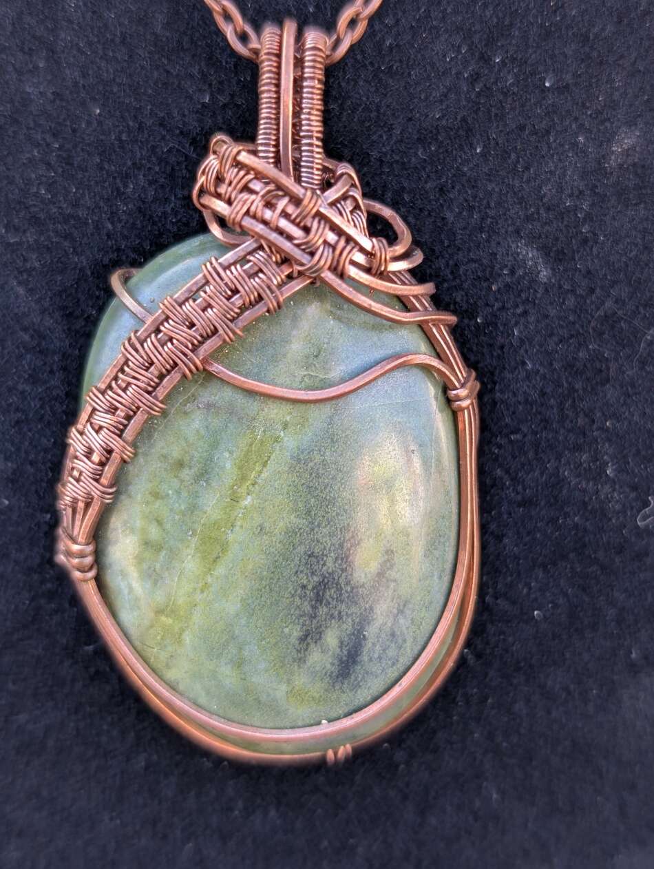 This one-of-a-kind pendant was created with different sizes of copper wire twisted and bent to hold the stone securely.