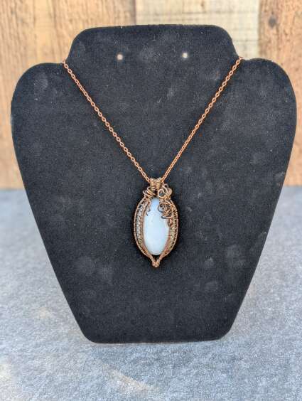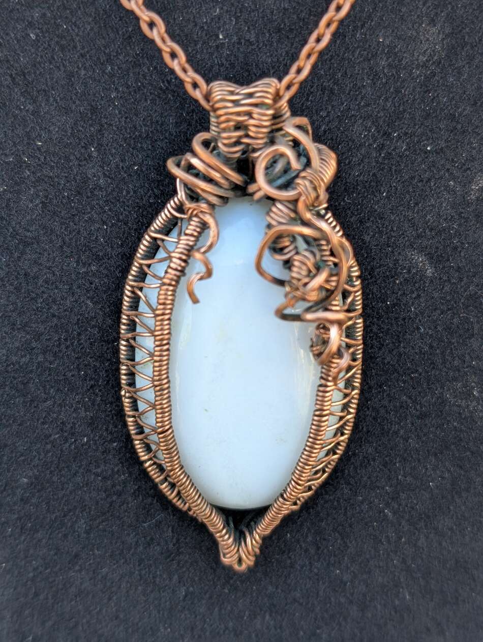 This one-of-a-kind pendant was created with different sizes of copper wire twisted and bent to hold the stone securely.
