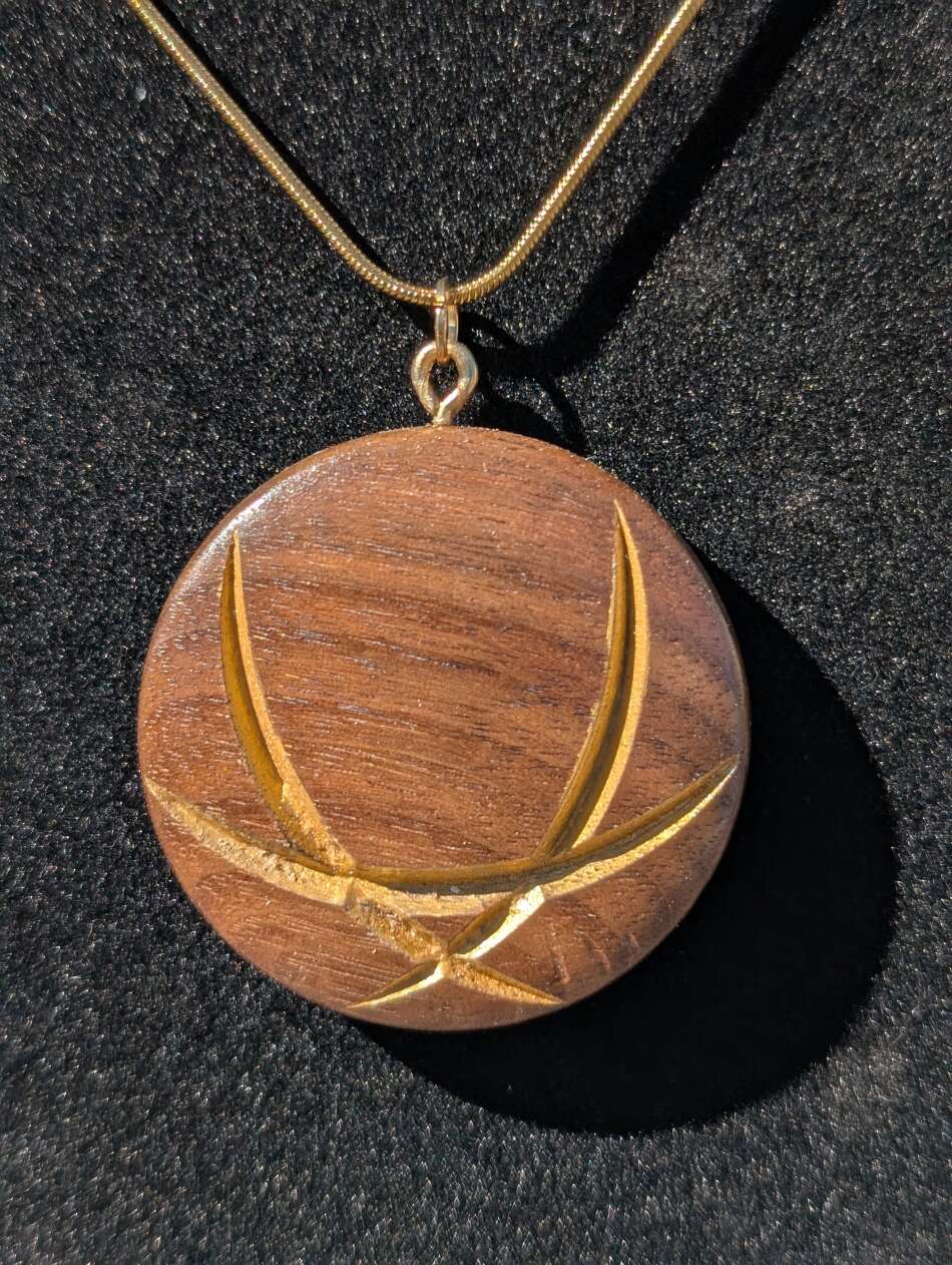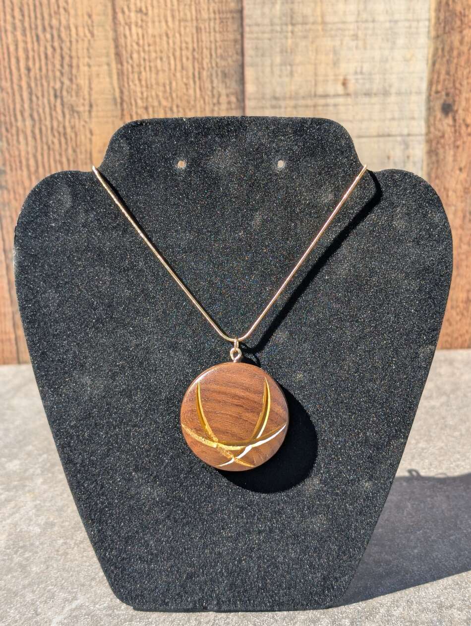 The beautiful grain of this Black Walnut is complimented with the gold on this unique wood pendant.