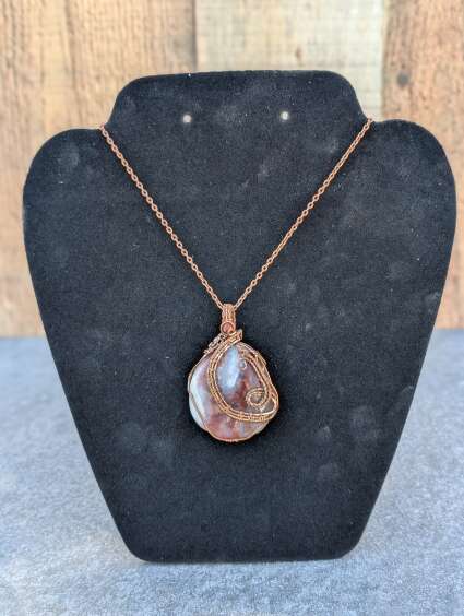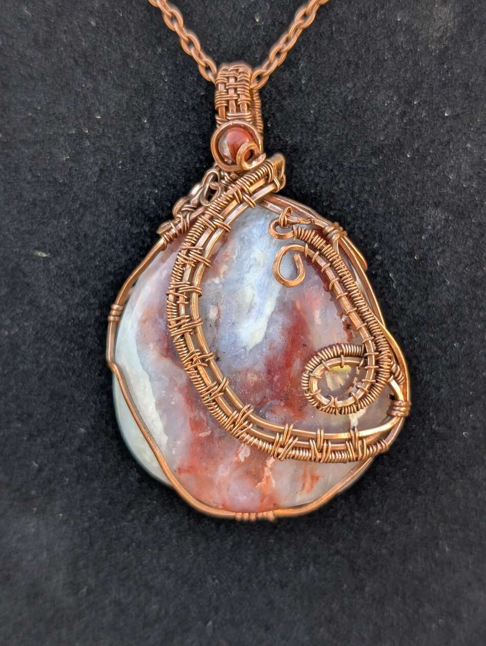 This one-of-a-kind pendant was created with different sizes of copper wire twisted and bent to hold the stone securely.