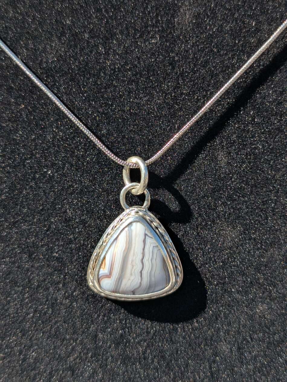 A stunning Crazy Lace Agate is encased in a Fine Silver bezel. The remainder of the pendant is hand-crafted of Sterling Silver.