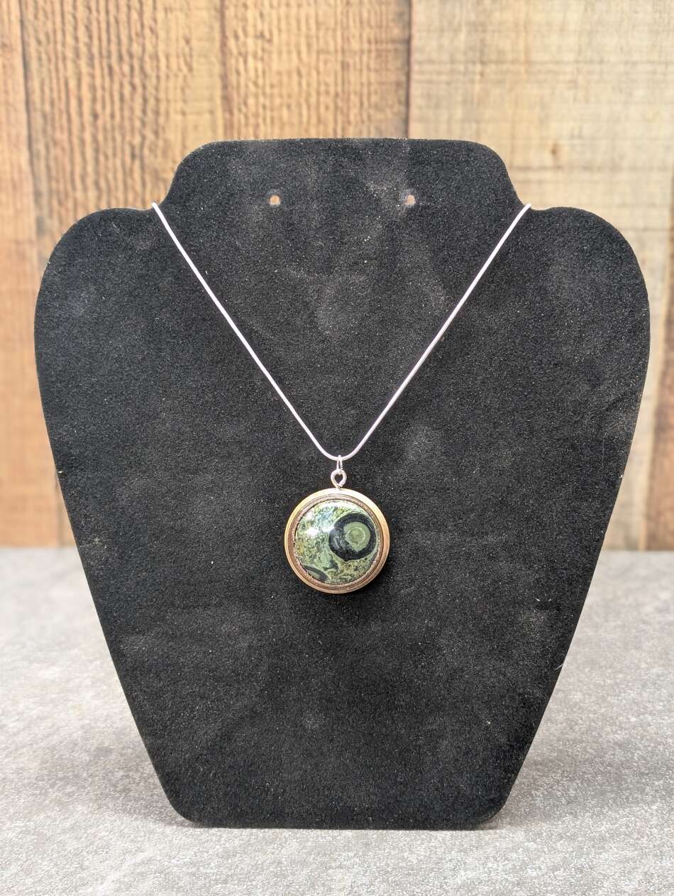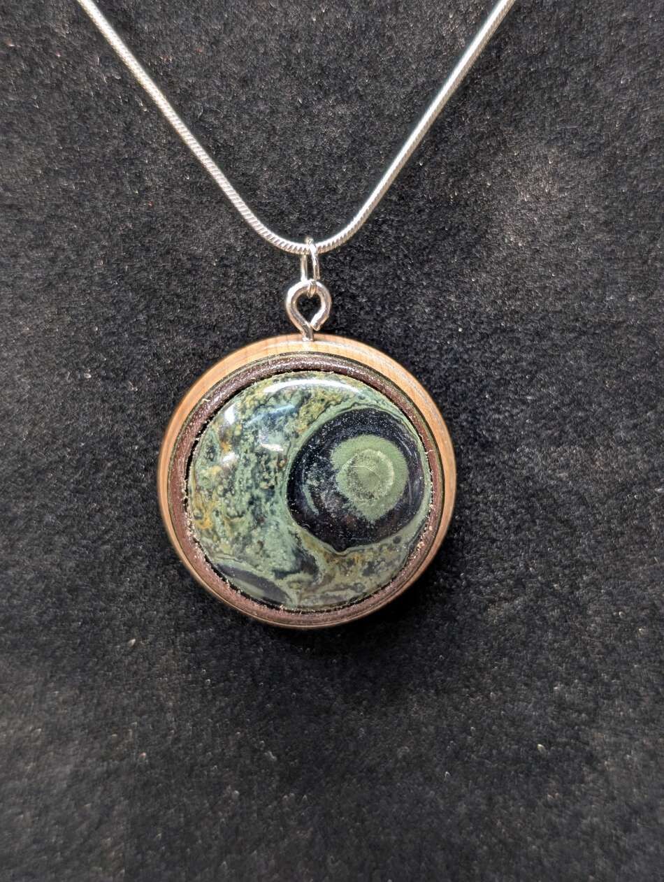 This unique pendant features a Kambaba Jasper stone. It is also sometimes called Galaxy Jasper. The wood was layered with Maple, black and green veneer, and Black Walnut, all turned on the lathe.