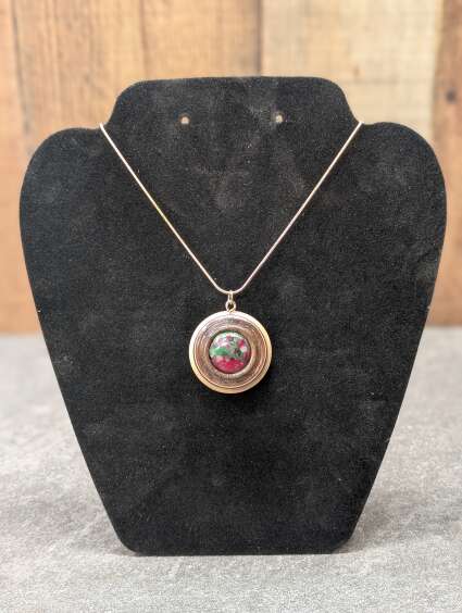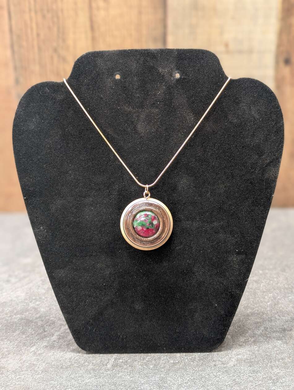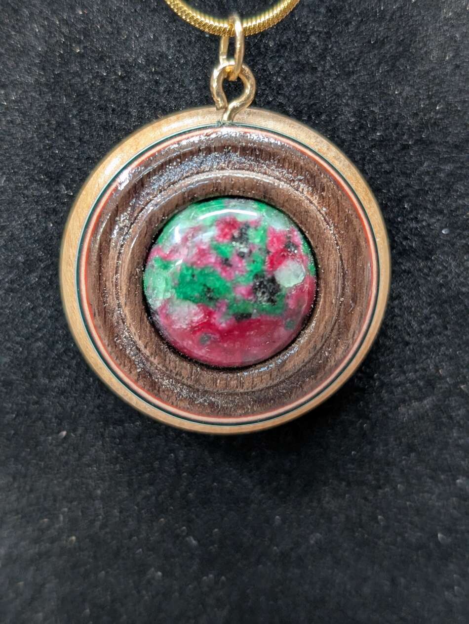This unique pendant features a Ruby in Zoisite. The wood was layered with Maple, red, white and green veneer, and Black Walnut, all turned on the lathe.