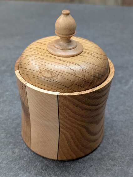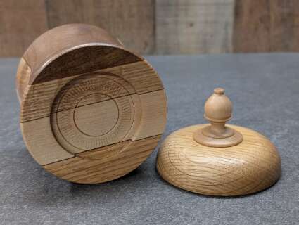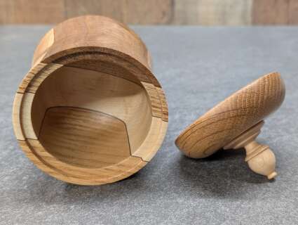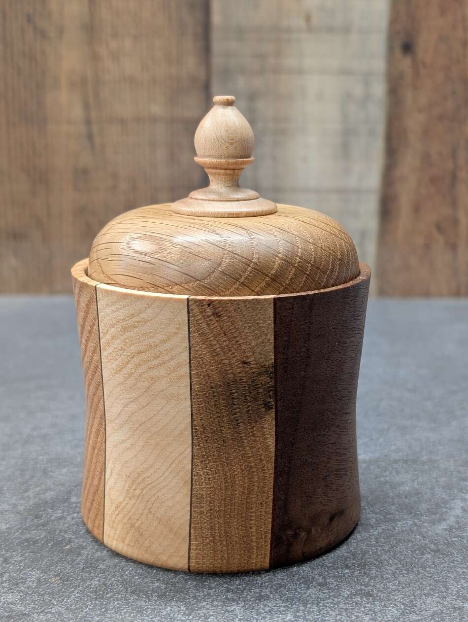 This lidded Box has a Black Walnut, Maple, and Oak base. It has an Oak Lid and Maple finial.