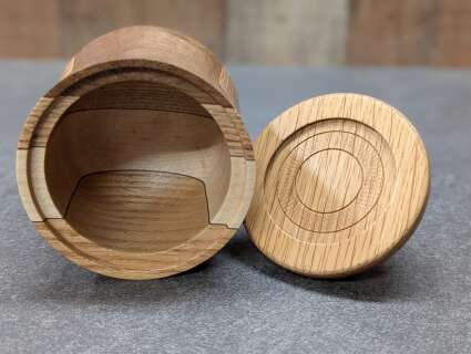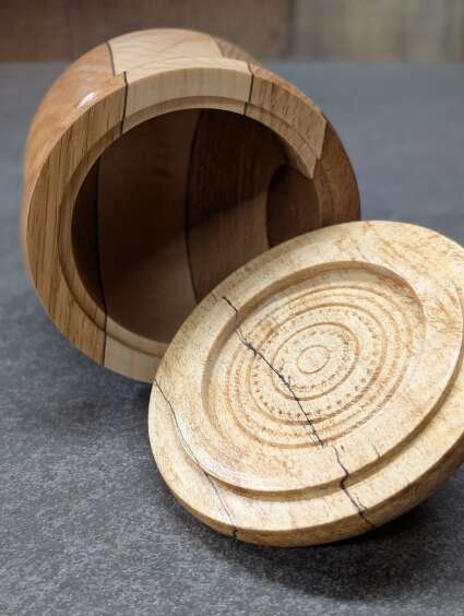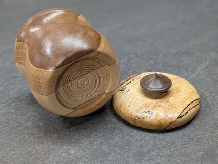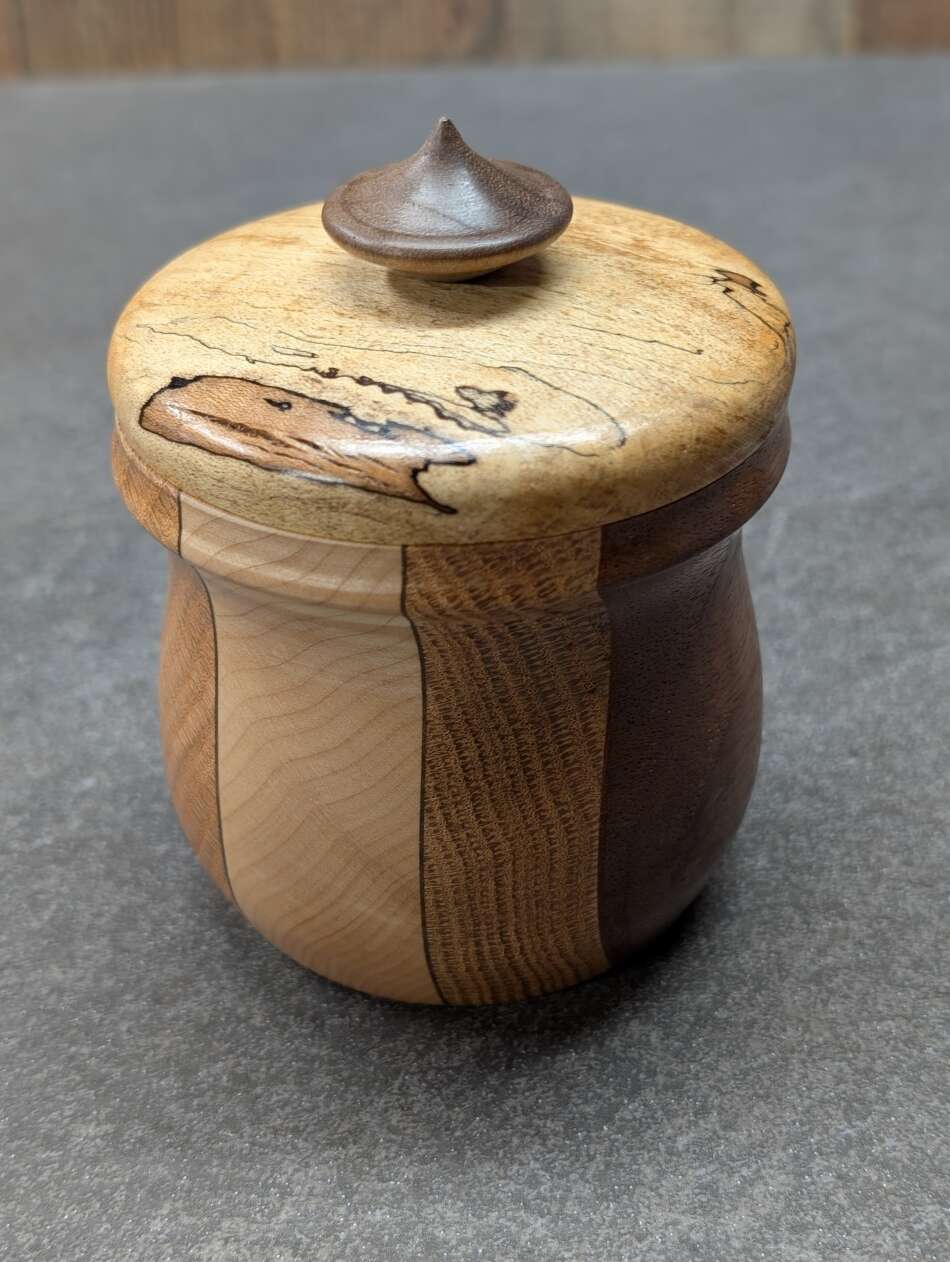 This lidded Box has a Black Walnut, Maple, and Oak base. It has a Spalted Maple lid and Black Walnut finial.