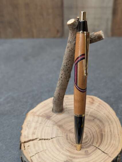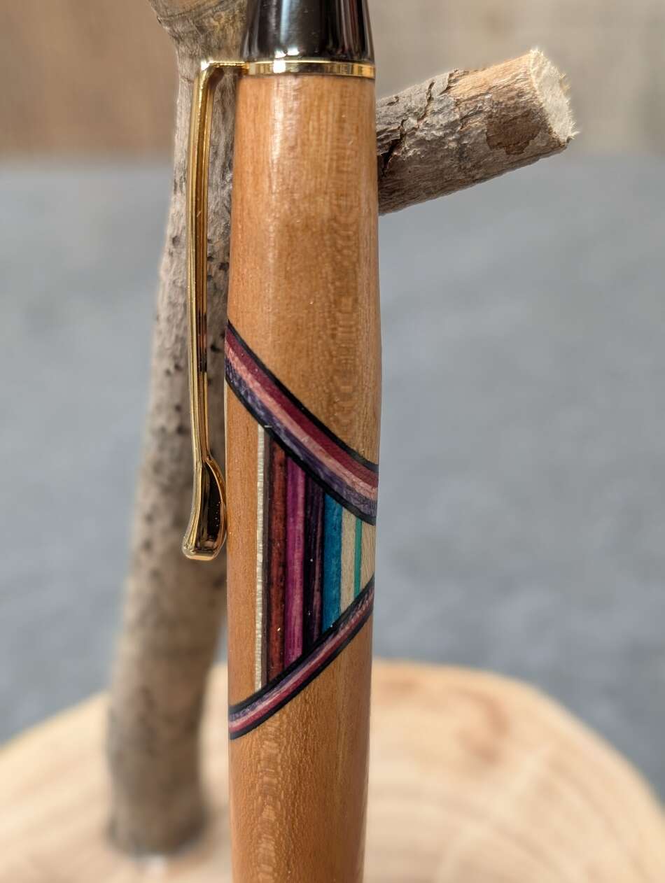 This pen was turned from Cherry and features many colors of dyed wood veneer.