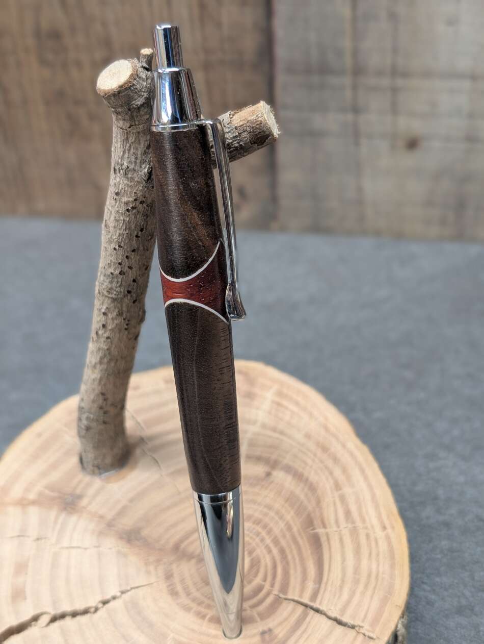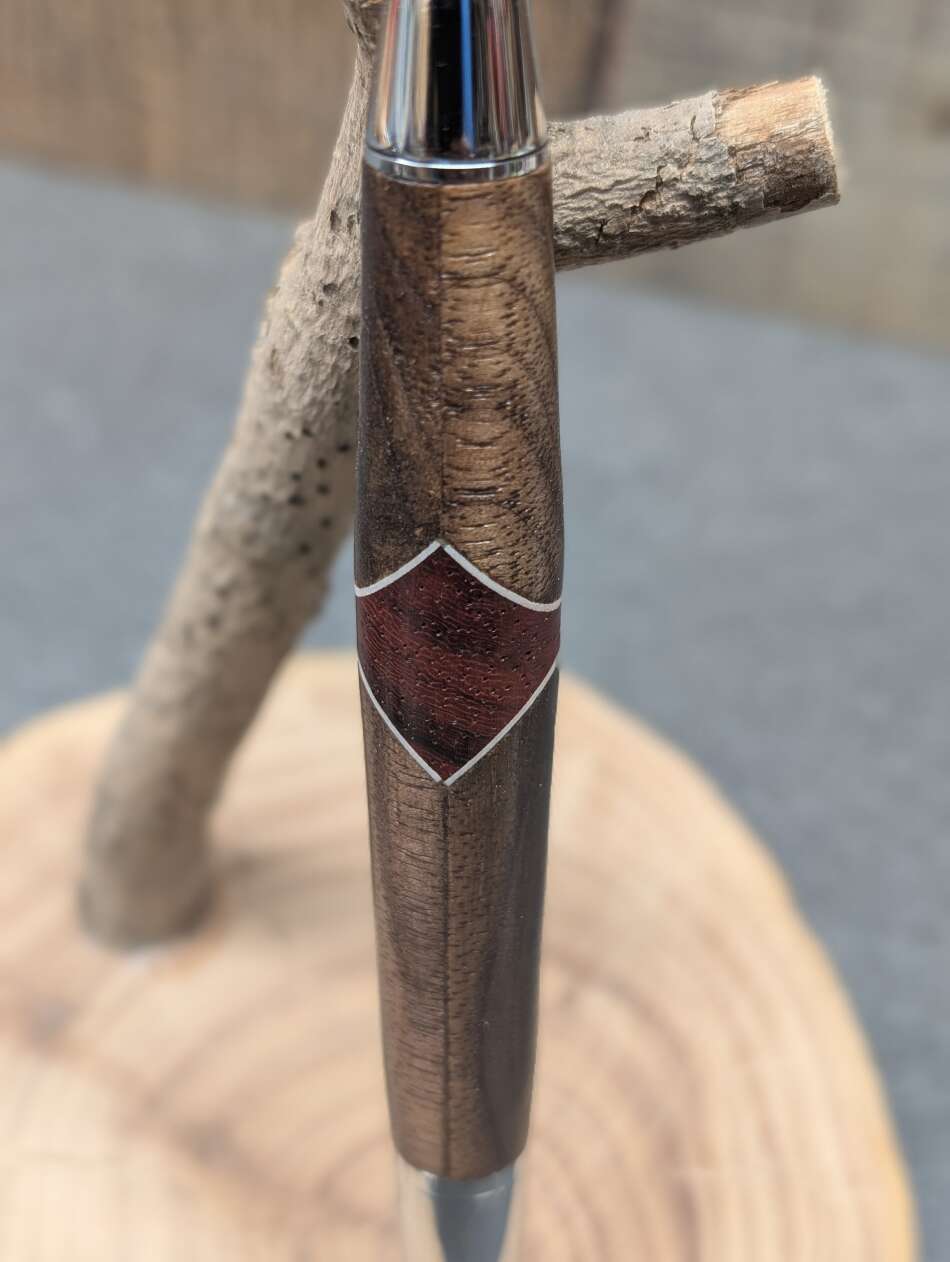This pen is Black Walnut and Padauk which is surrounded by white veneer.