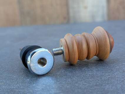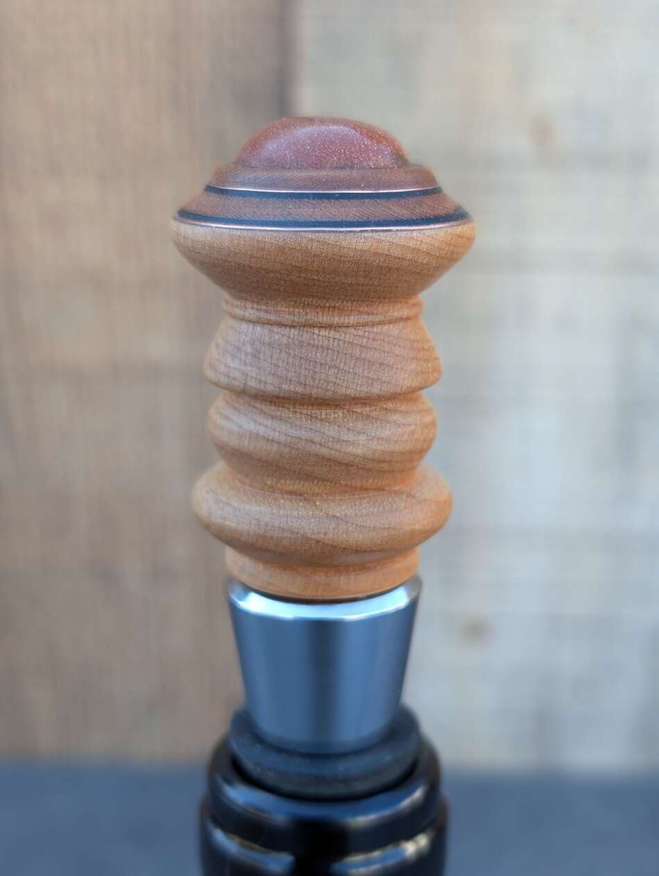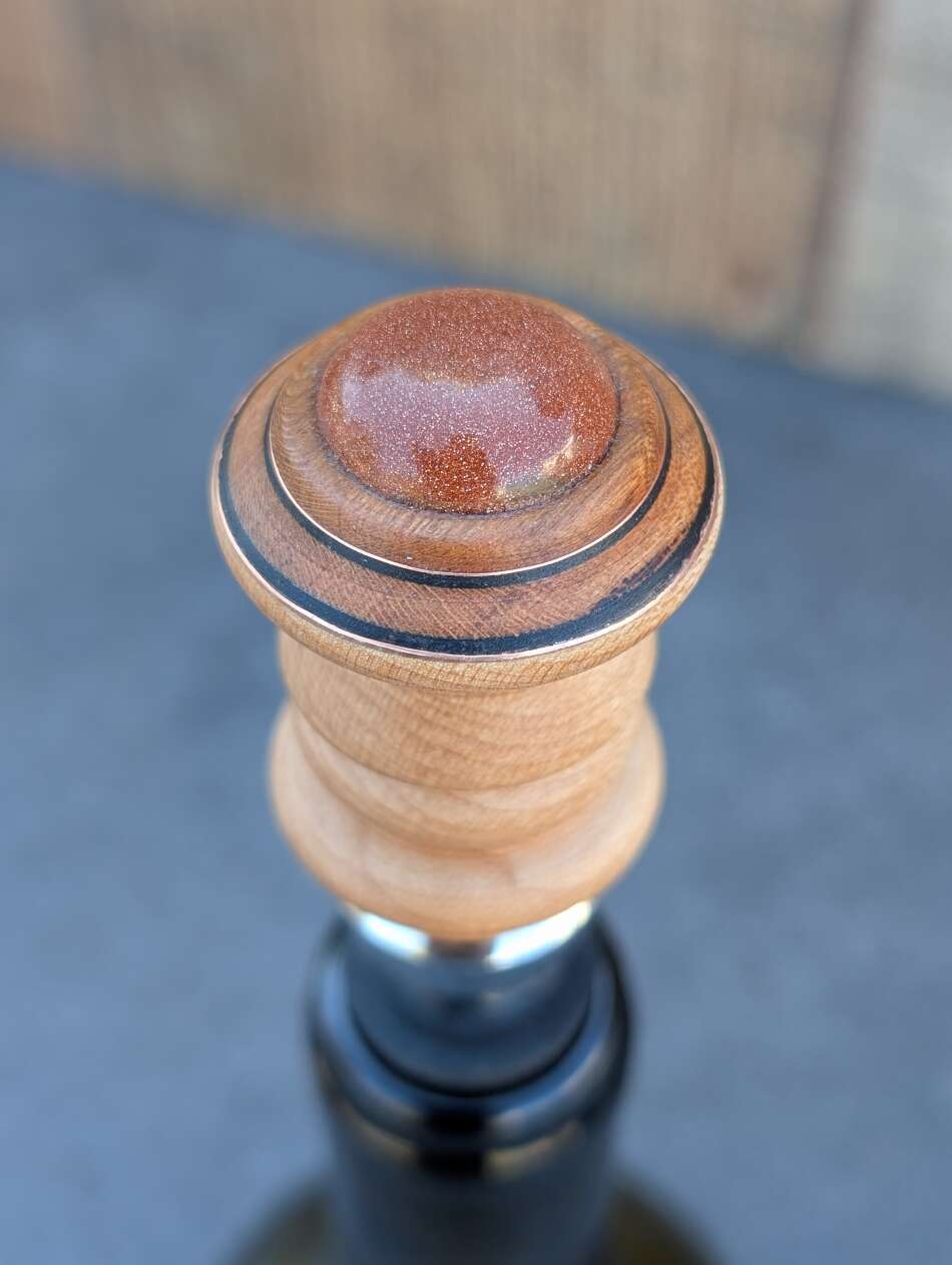 This maple stopper features copper, and black accents with a gorgeous Sunshine stone.