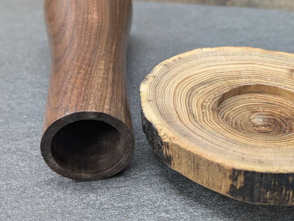 The top is made of Dogwood and the stem is made of Black Walnut.