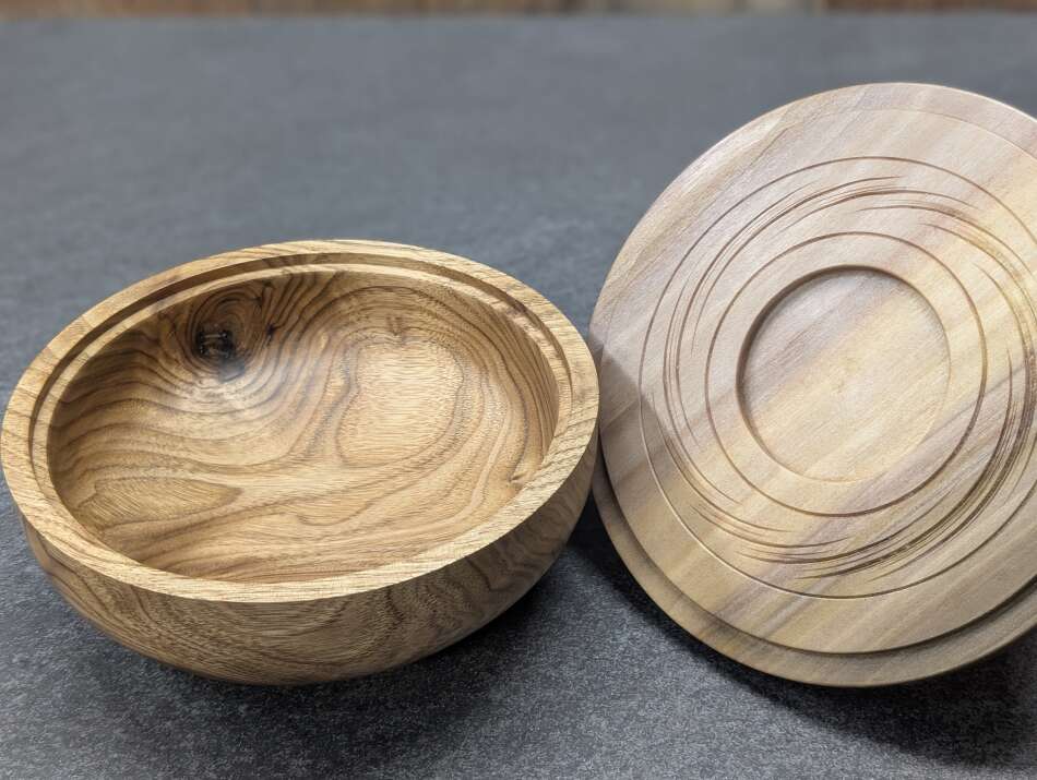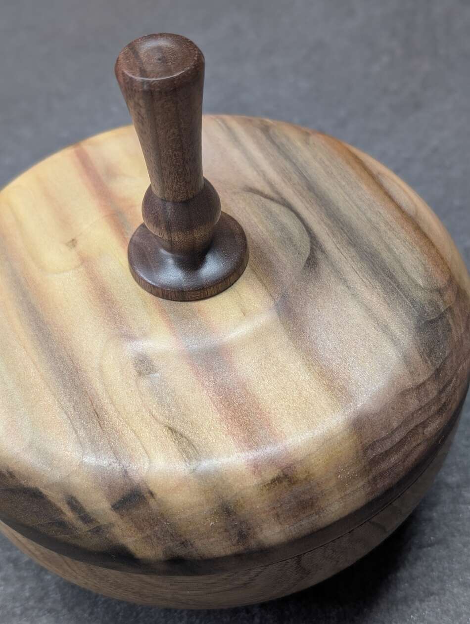 This lidded Bowl has a Butternut base, a Rainbow Poplar lid, the finial is Black Walnut.