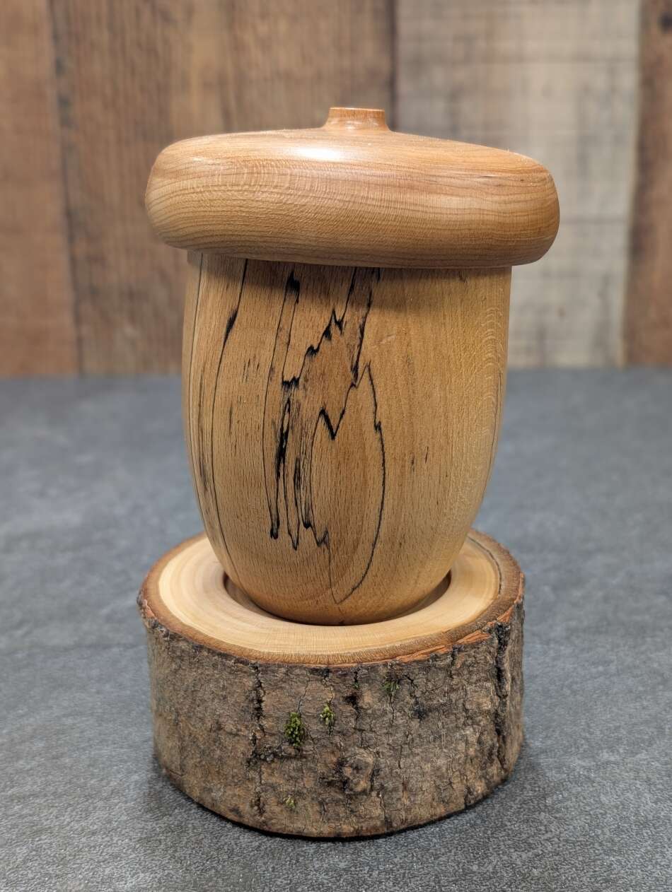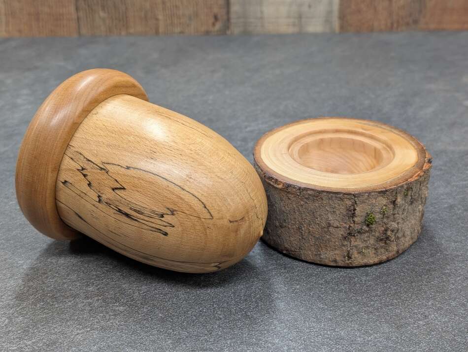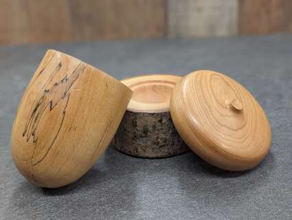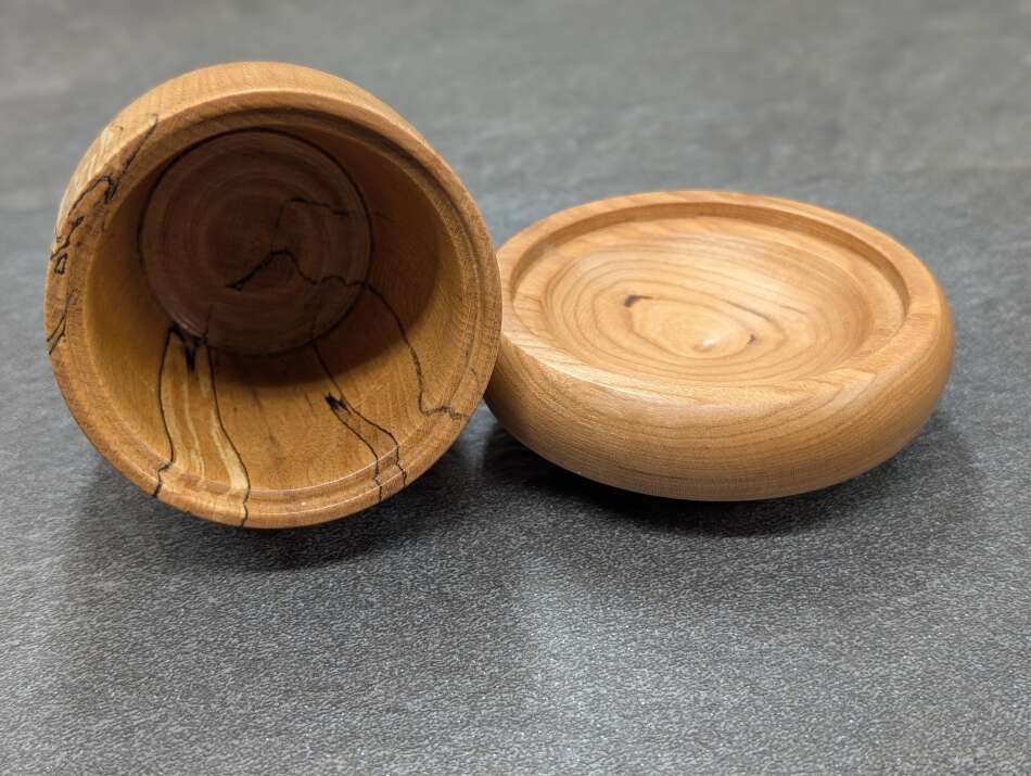The top is made of Cherry and the bottom is made of Spalted Beech.