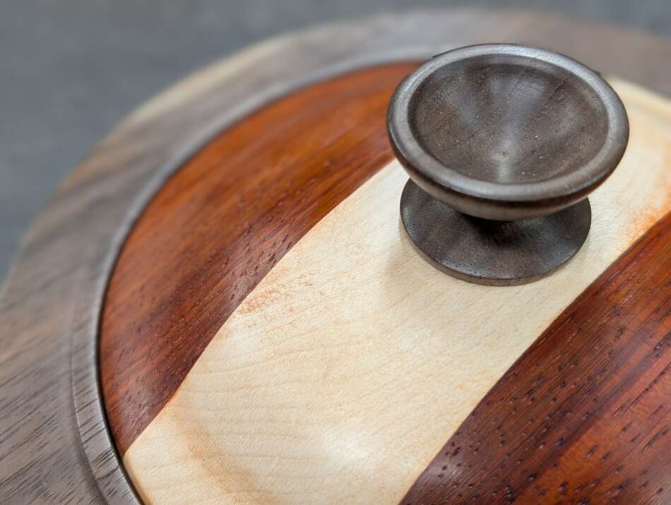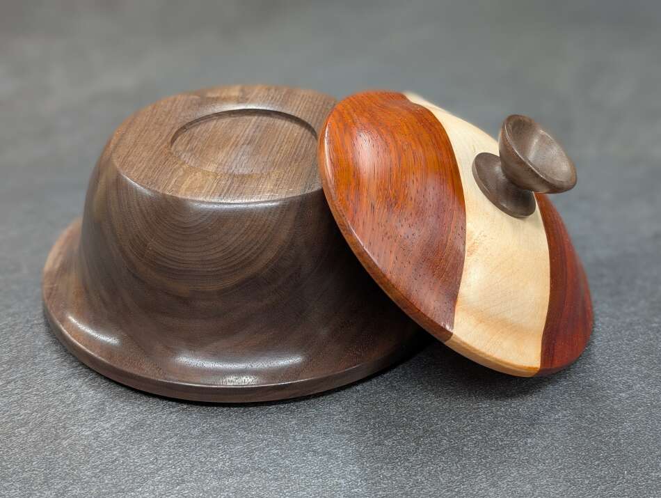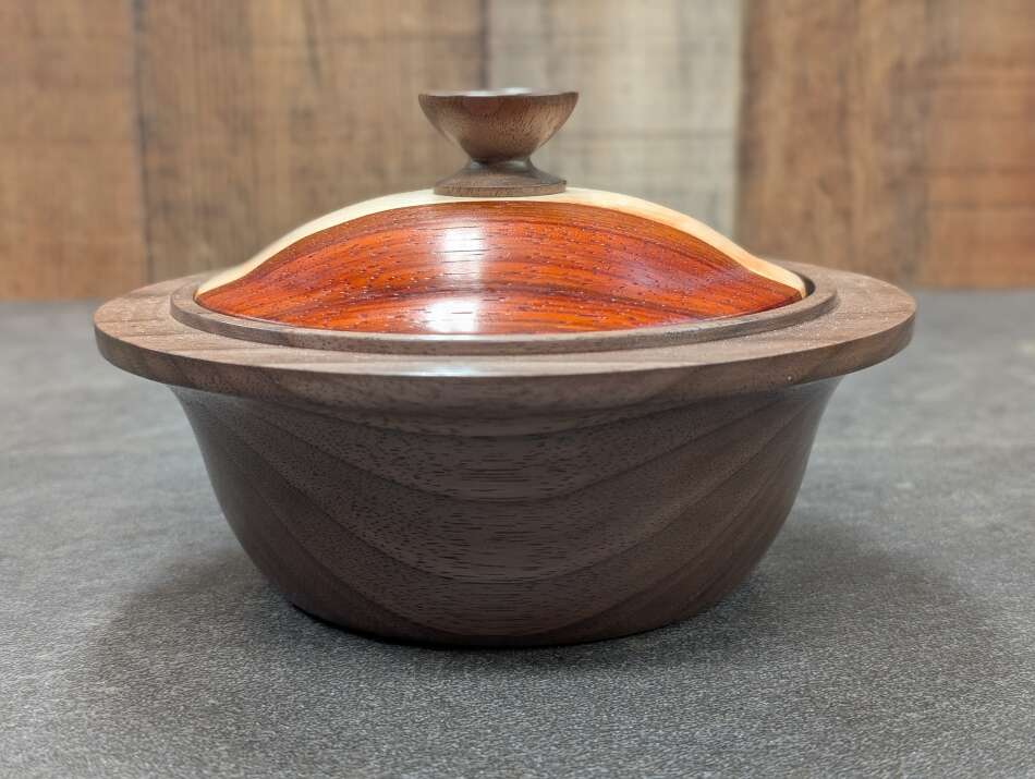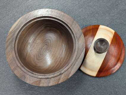 This lidded bowl has a Black Walnut base with a lid made from a strip of Sugar Maple sandwiched between two pieces of African Padauk. The Black Walnut finial provides an easy way to lift the lid.