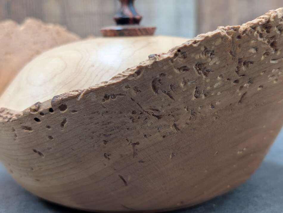 The Cherry base has fallen victim to some busy little critters! Fortunately, their work created a beautiful pattern on this Black Cherry bowl.