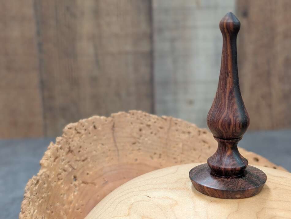 The Sugar Maple Lid and a rare Nicaraguan Rosewood finial keep the contents safe and contained.