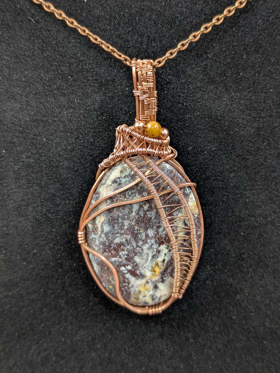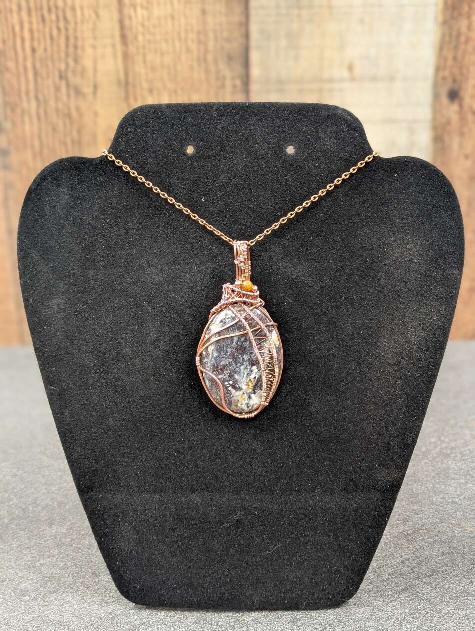 This one-of-a-kind pendant was created with different sizes of copper wire twisted and bent to hold the stone securely.