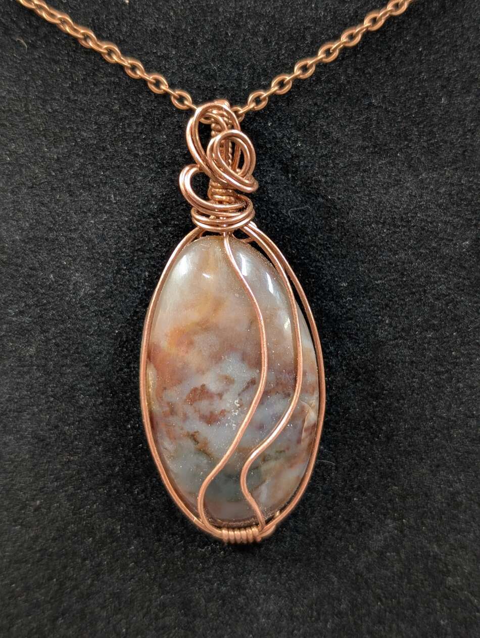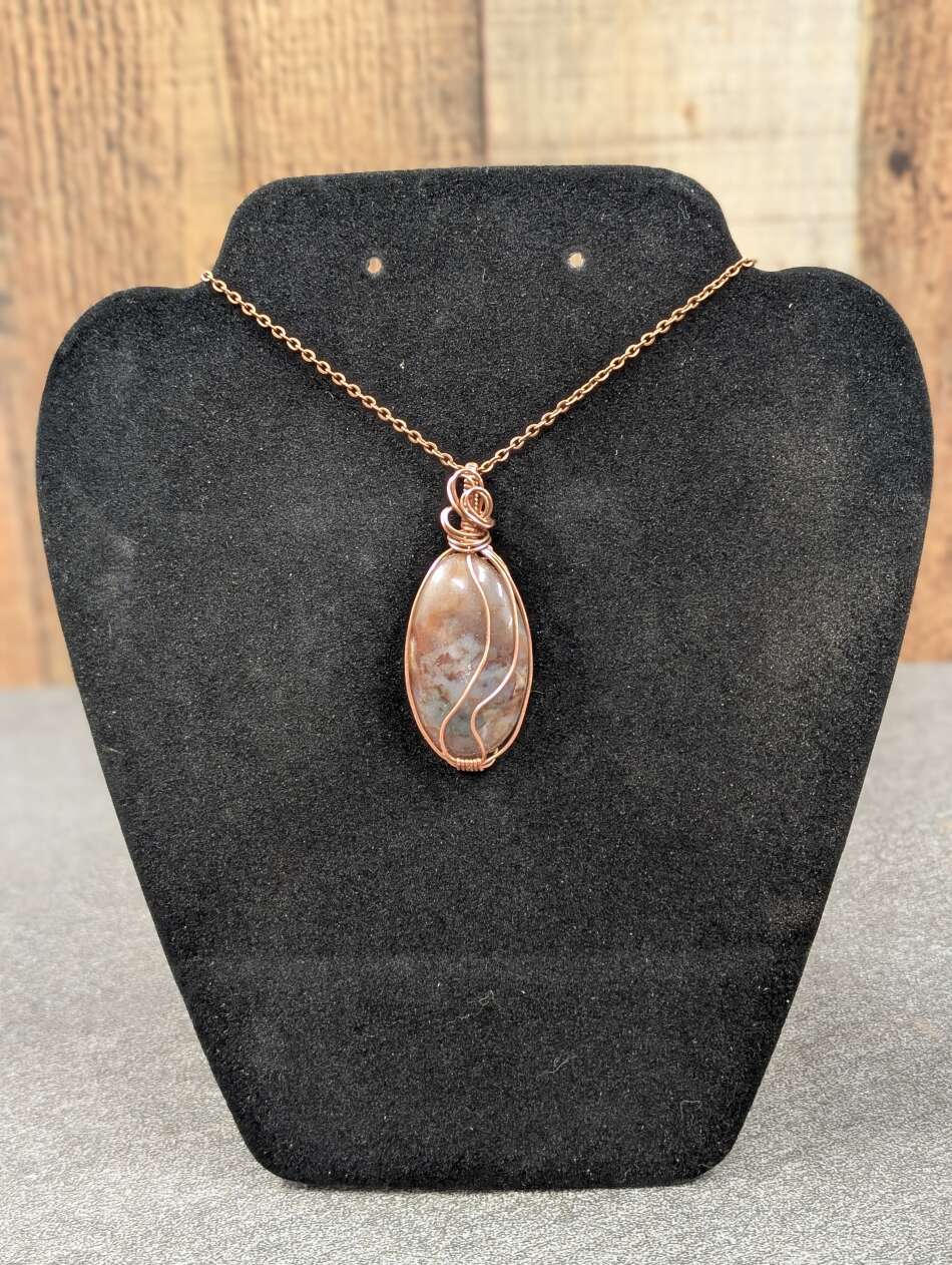 This one-of-a-kind pendant was created with different sizes of copper wire twisted and bent to hold the stone securely.