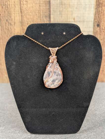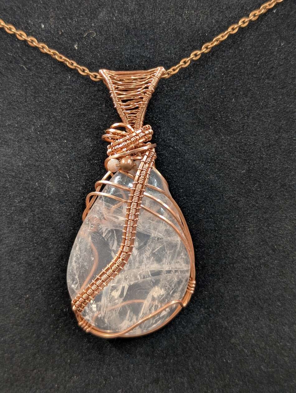This one-of-a-kind pendant was created with different sizes of copper wire twisted and bent to hold the stone securely.