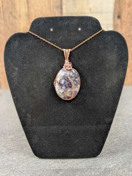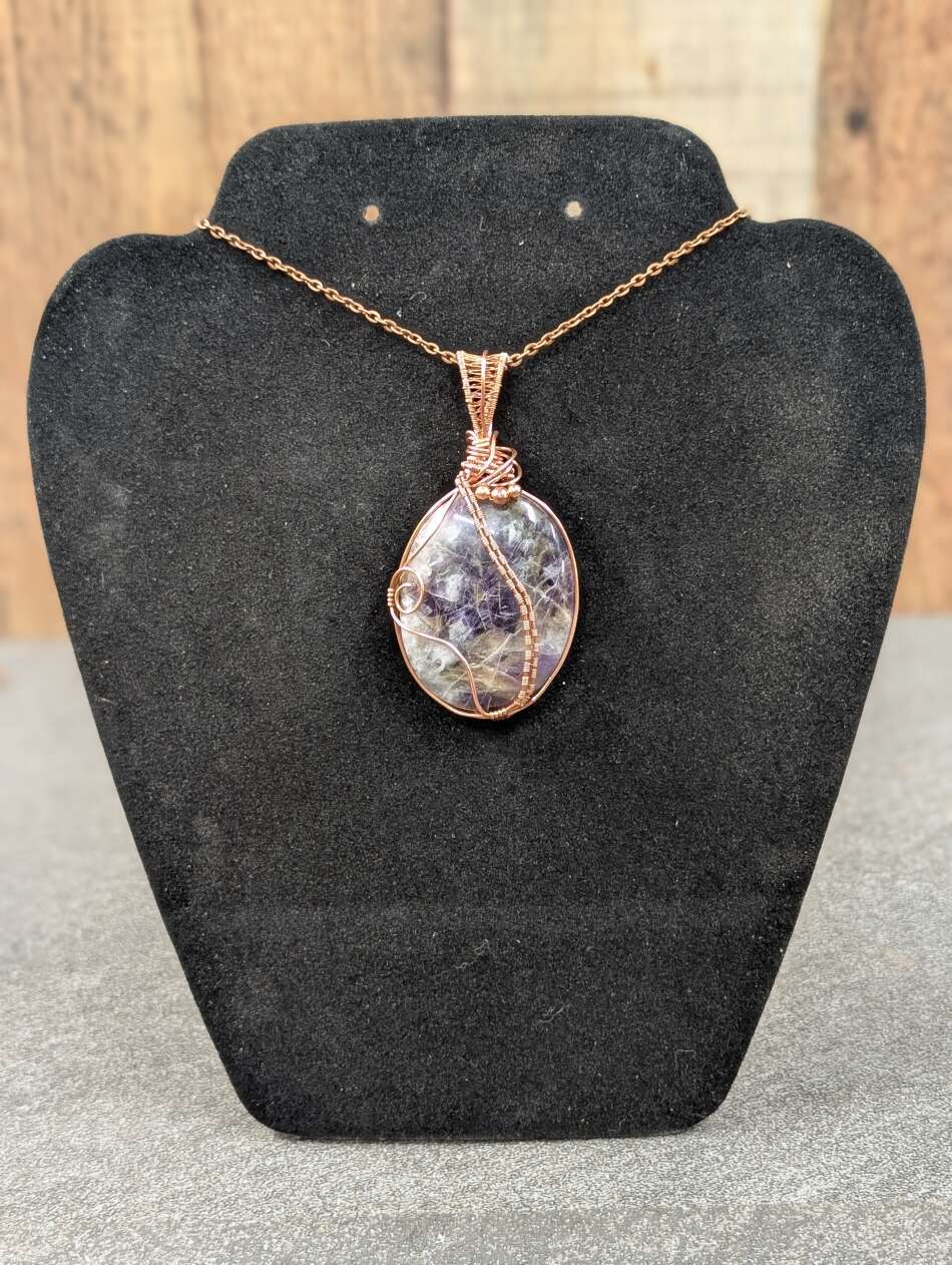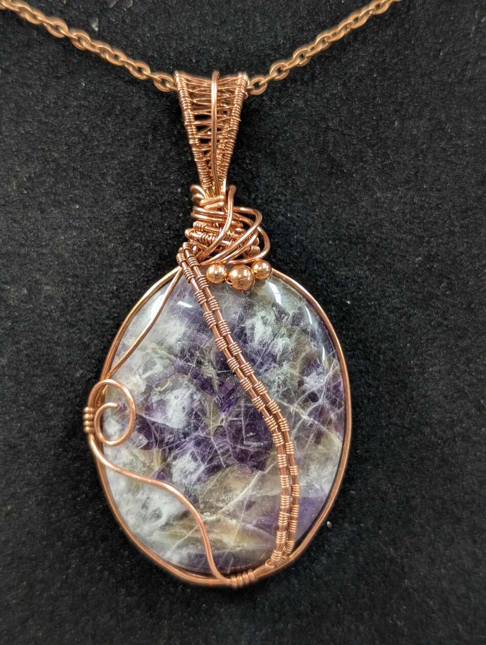 This one-of-a-kind pendant was created with different sizes of copper wire twisted and bent to hold the stone securely.