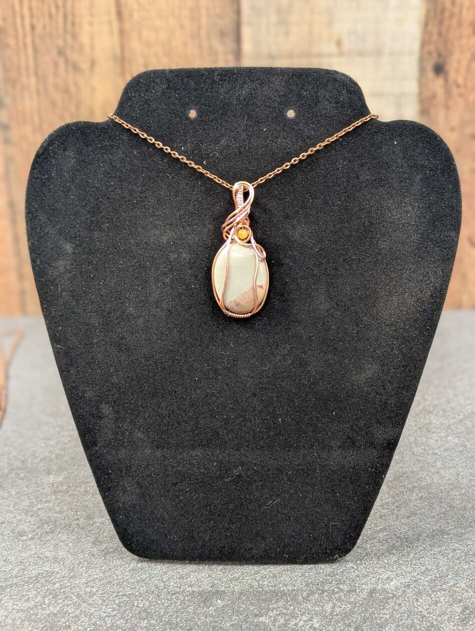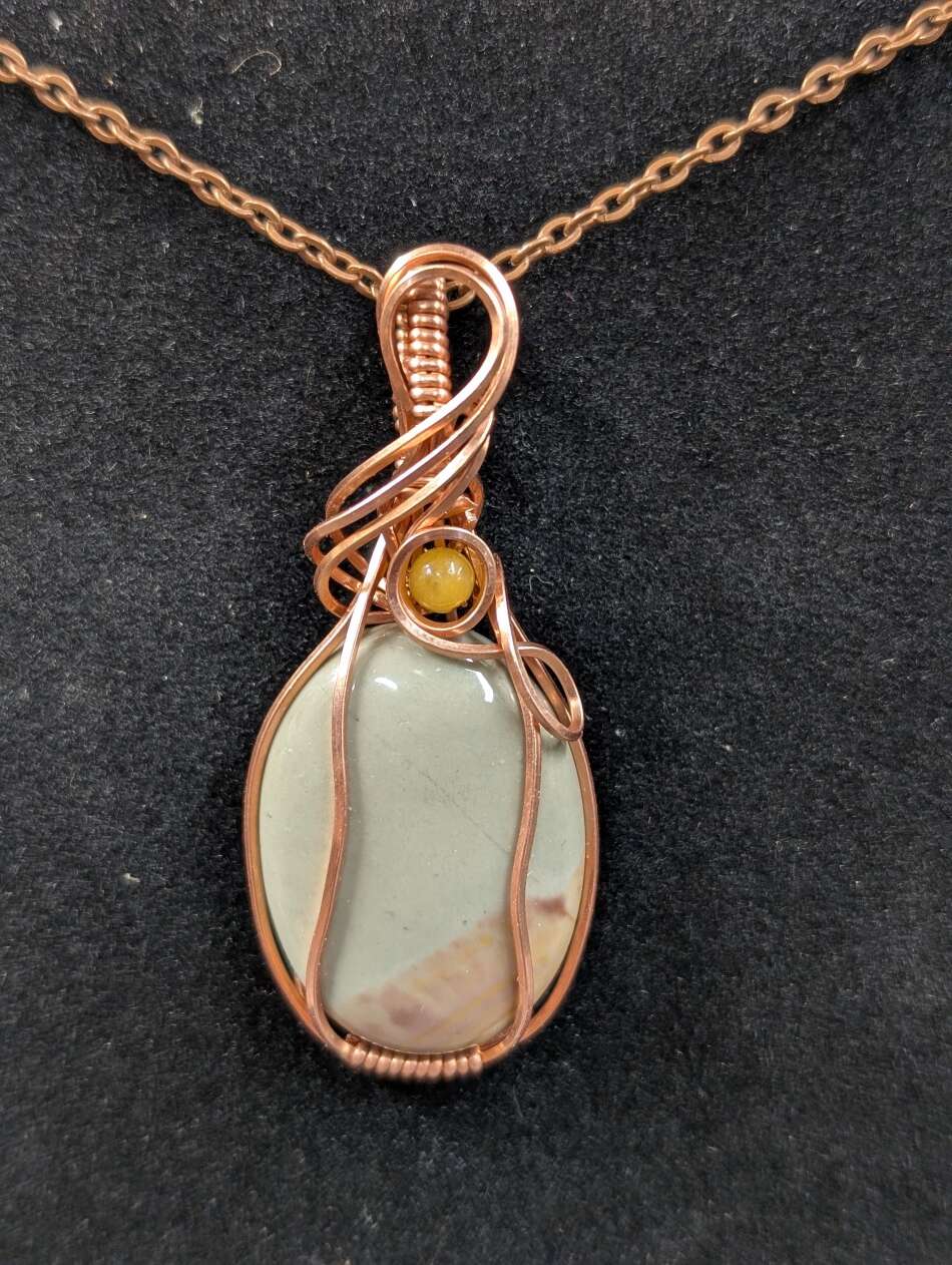 This one-of-a-kind pendant was created with different sizes of copper wire twisted and bent to hold the stone securely.