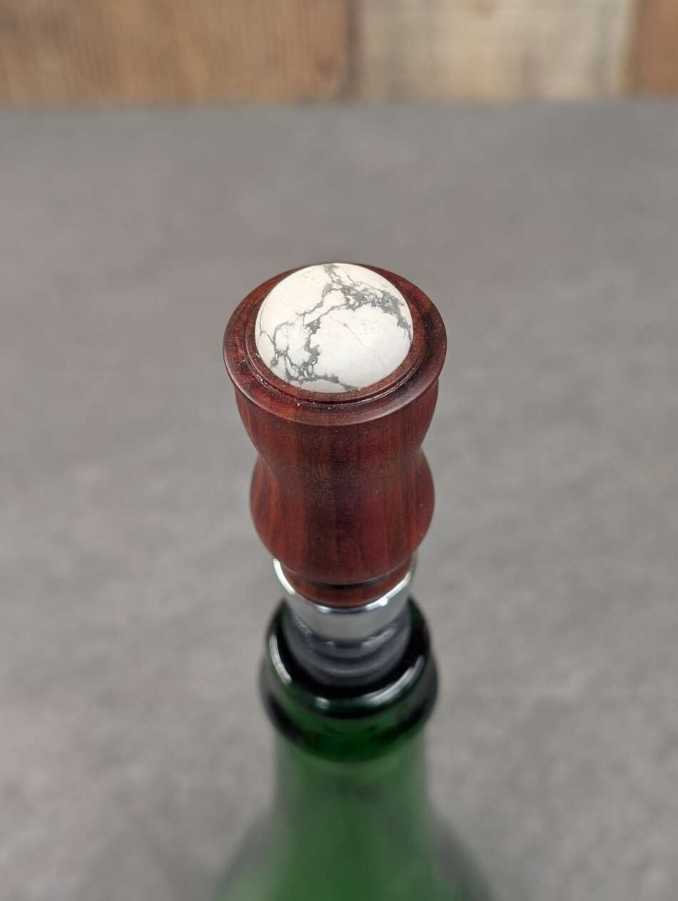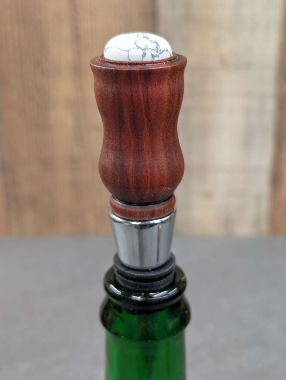 This stopper is made of Redheart with a Howlite cabochon.