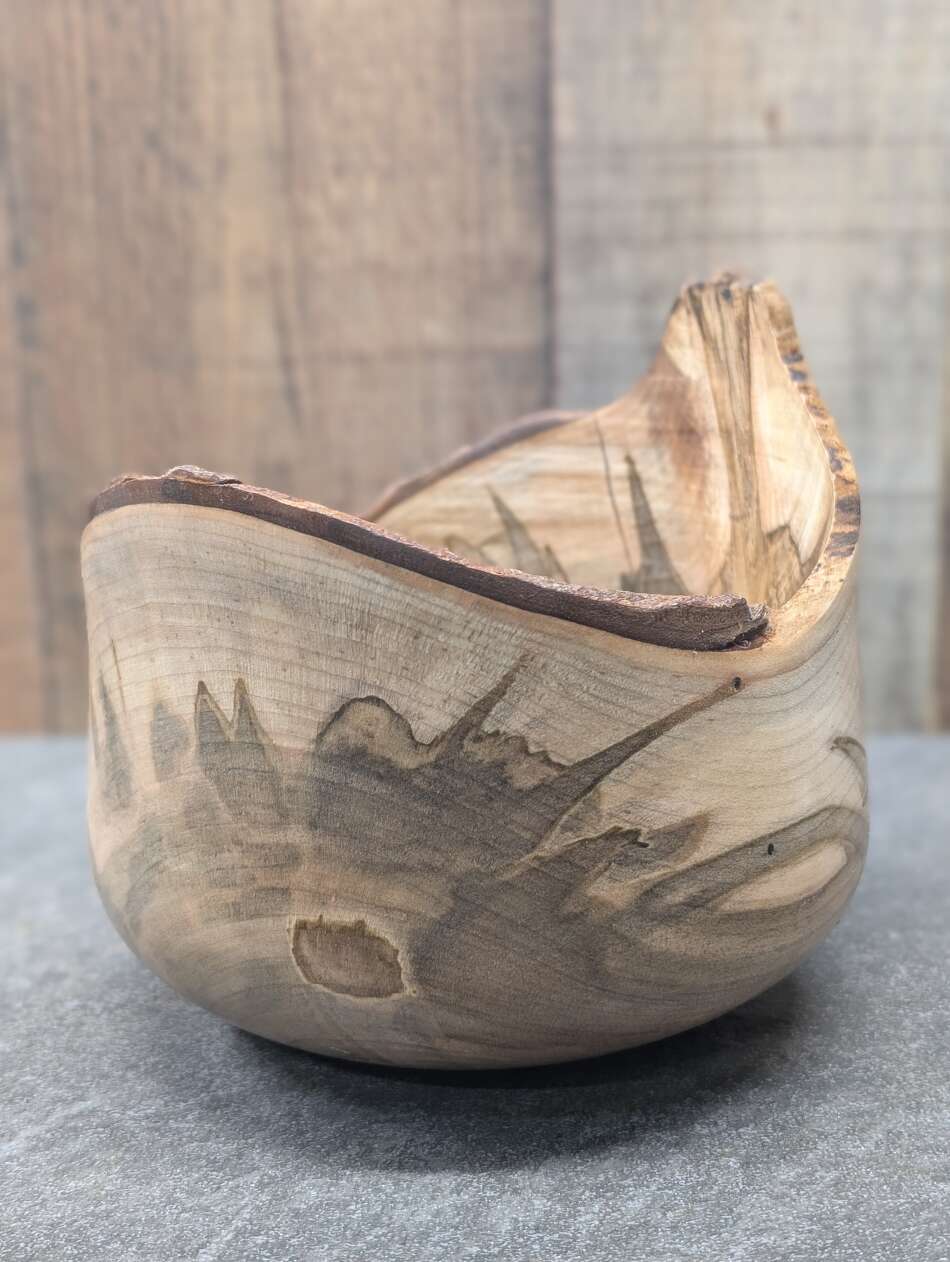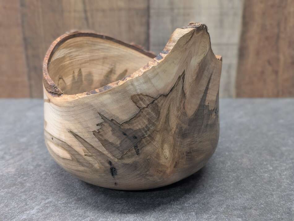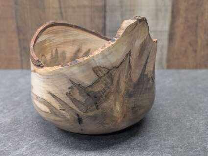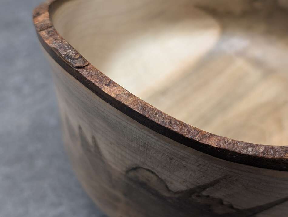 This bowl has very thin walls and features a live edge bark rim.