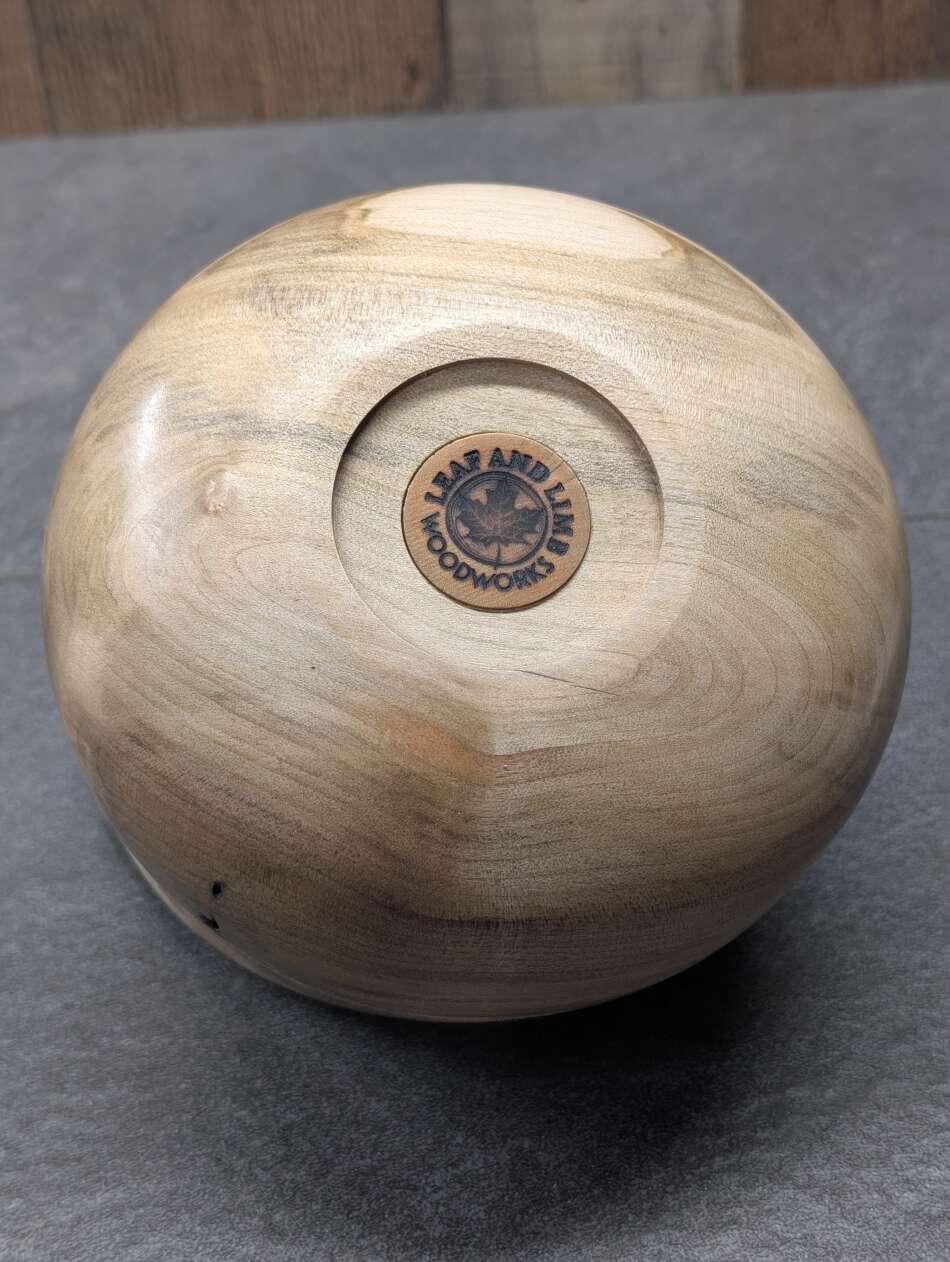 This Maple Bowl is named for ambrosia fungi, which is found in association with ambrosia beetles. The beetles bore into the trunk of the tree, bringing with them the ambrosia fungi, which subsequently stains and discolors the surrounding wood.